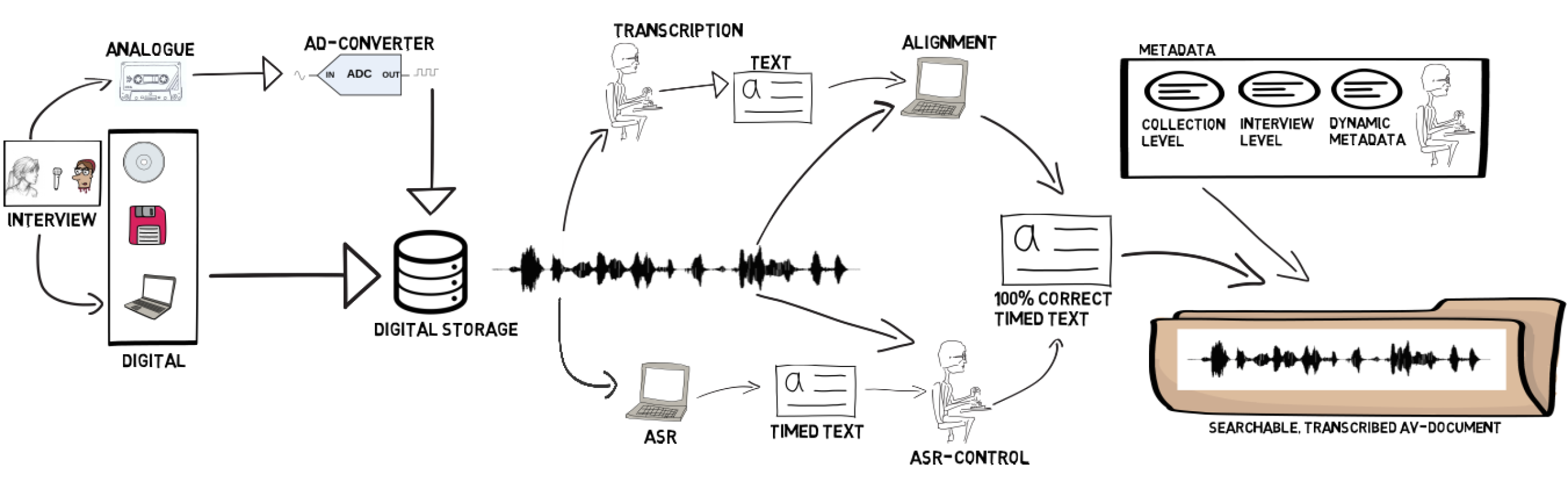 All these technologies can be used for different disciplines of Spoken Content. However, on this website we will sometimes focus on Oral History recordings: recordings of mostly one interviewer and one interviewee about a special event in the past or someone’s life during a now closed period.