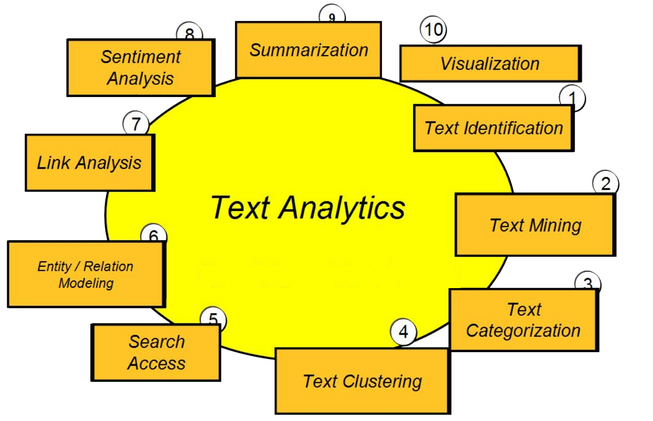 While ‘Text Analytics’ is a more generic term, more specific terms that are current in computer science and linguistics are ‘Natural Language Processing’ and ‘Text Mining’. NLP or Natural Languages Processing is the umbrella term for the processing, exploration and analysis of data using computational linguistic tools and approaches. ‘Text mining’ is the process of converting unstructured or semi-structured oral and written data into structured data for exploration, analysis, and interpretation. Other methodologies involve statistical tools and machine learning. The scheme below illustrates the variety of focuses when applying computational methods to text.